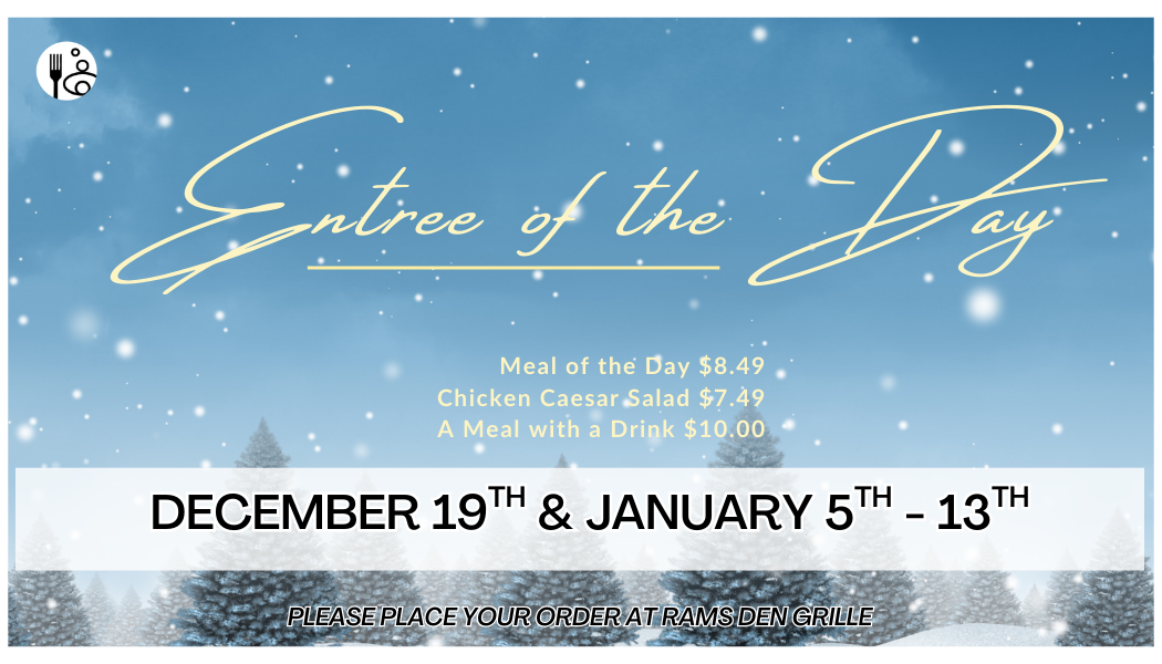 Now serving out of Ram’s Den Grille! We will be open for service on Friday, December 19, and throughout Winter Break (January 5–13), from 11:30 a.m. to 1:30 p.m.
